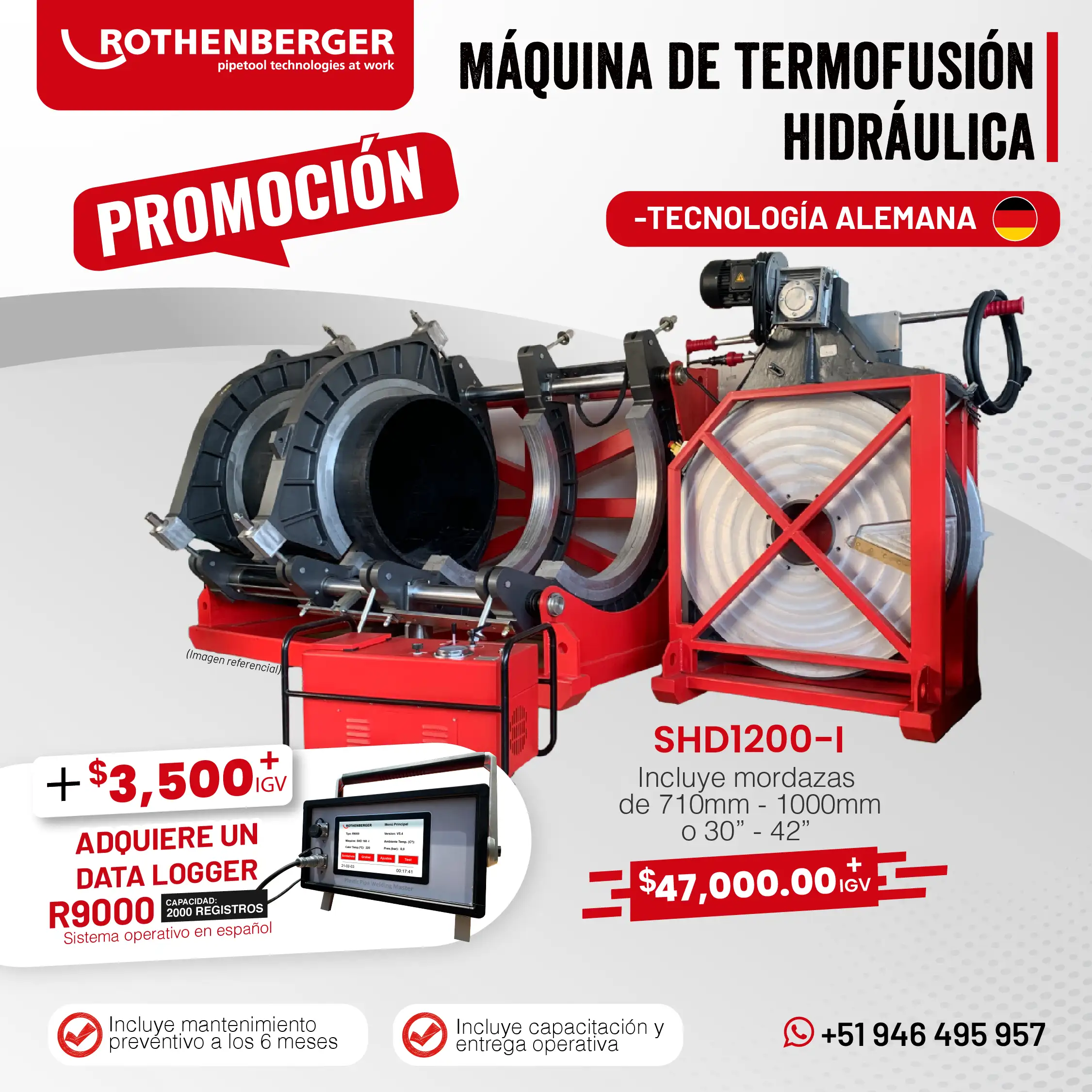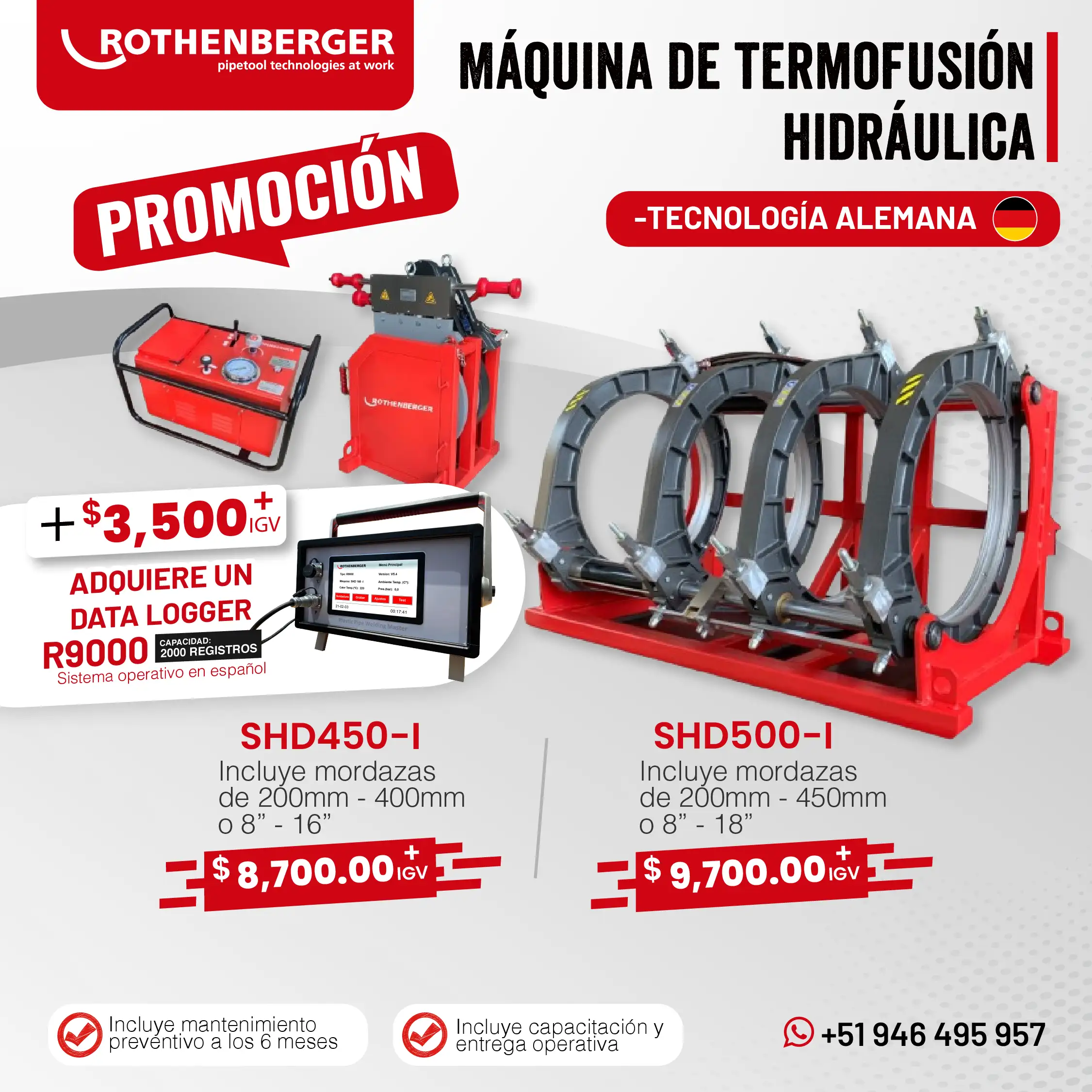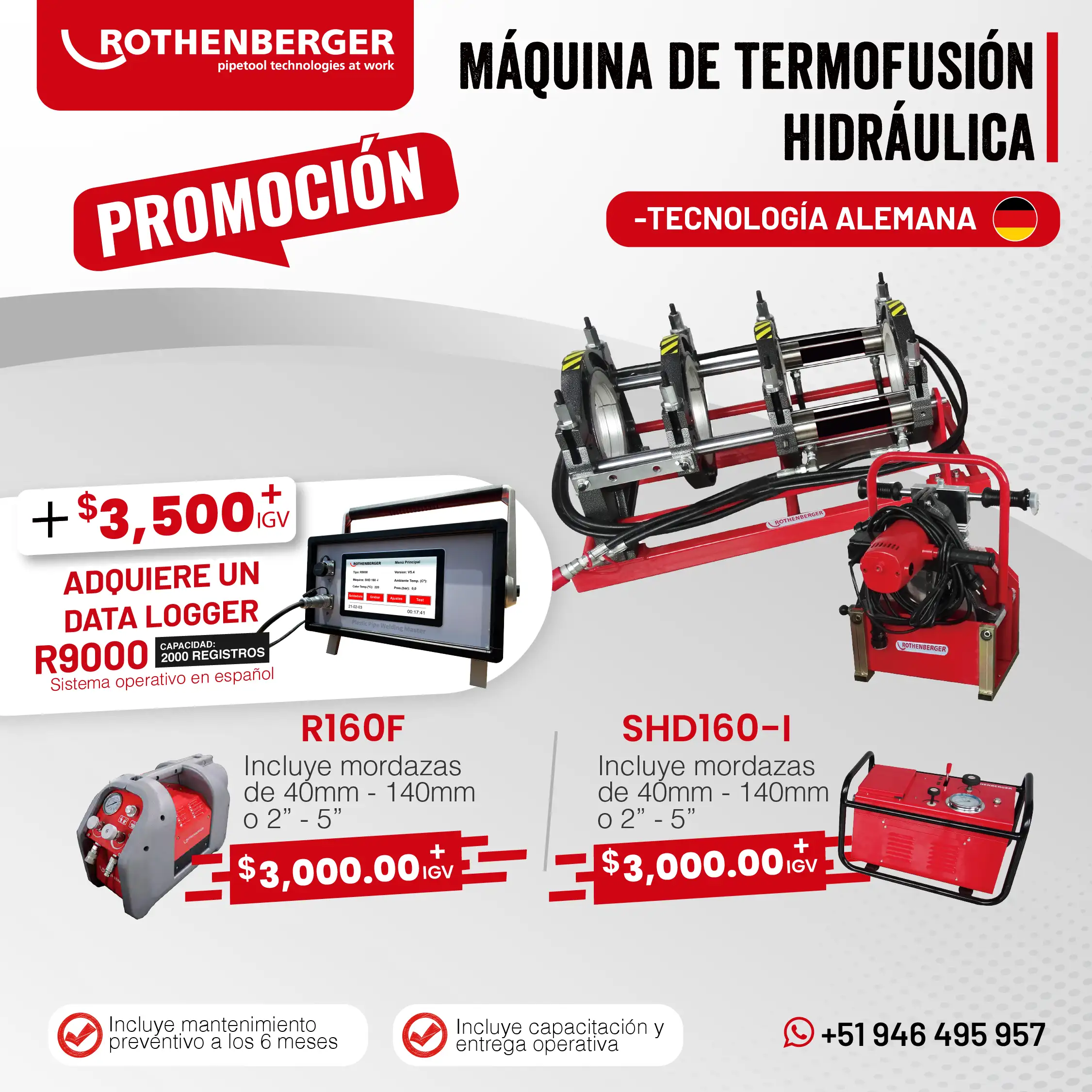 Las máquinas de termofusión y electrofusión de Rothenberger, fabricadas en Alemania y en China, son reconocidas por su eficiencia y confiabilidad en las tareas más exigentes de soldadura de tuberías. Su amplia gama de equipos y stock permanente permiten cubrir todas las necesidades que requiera la industria.