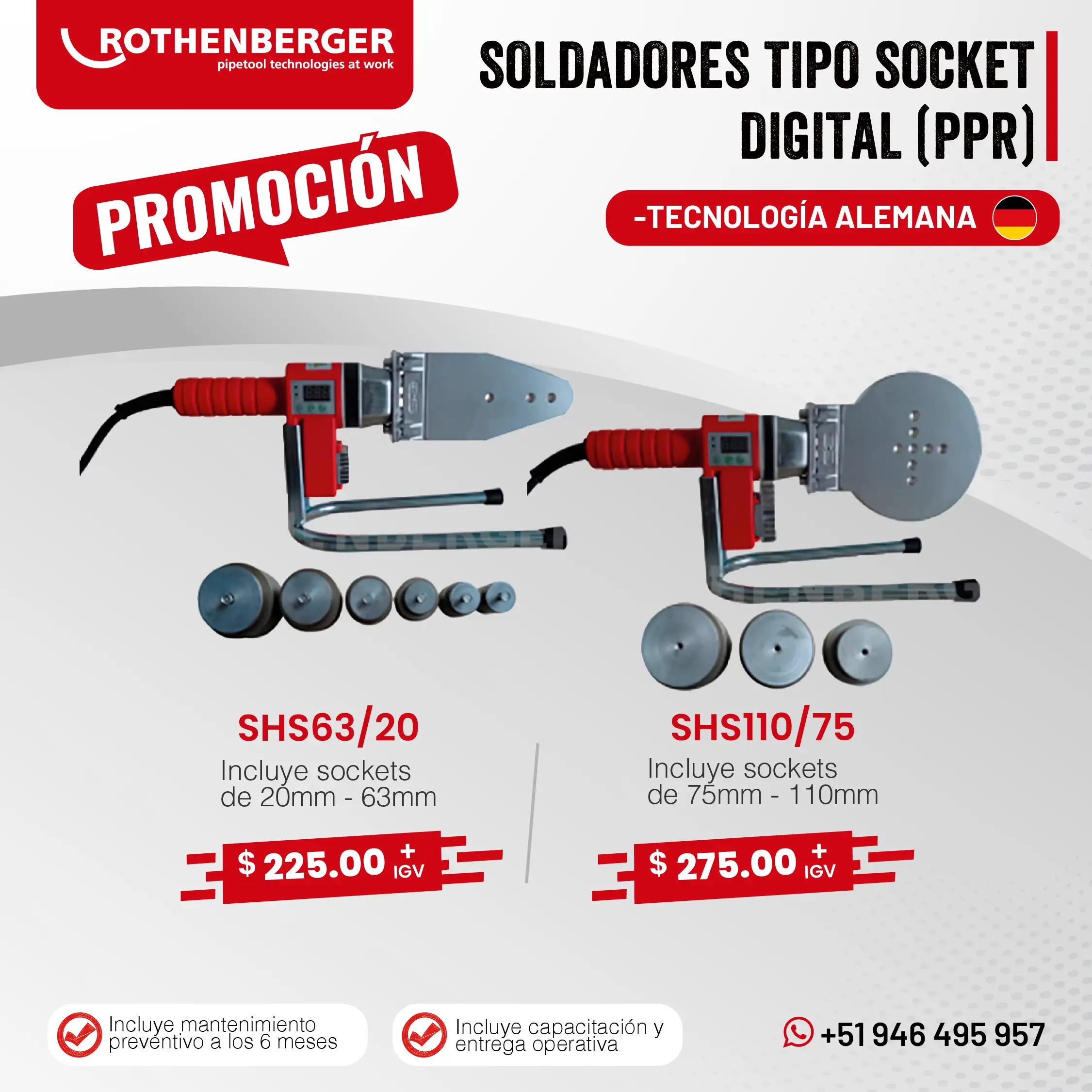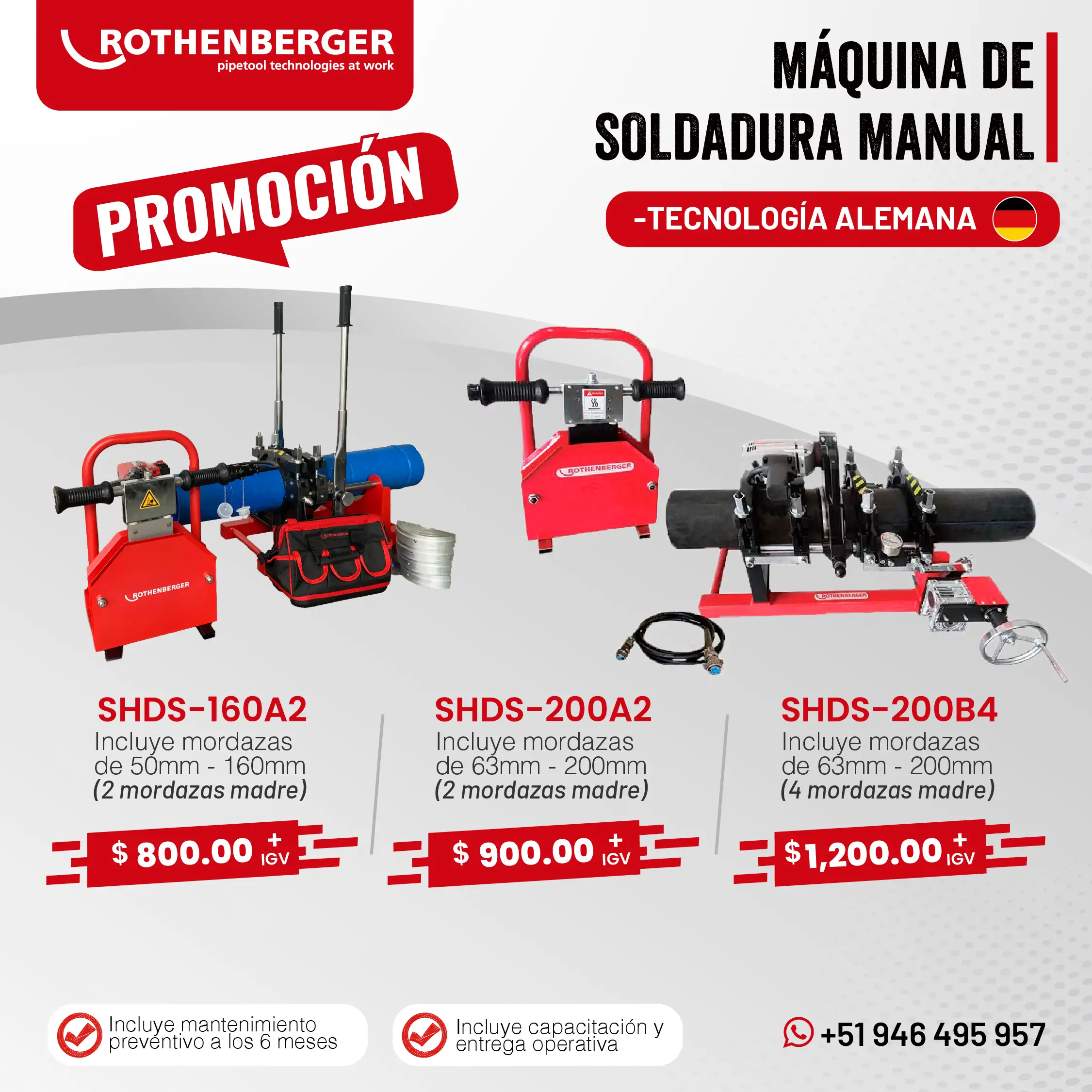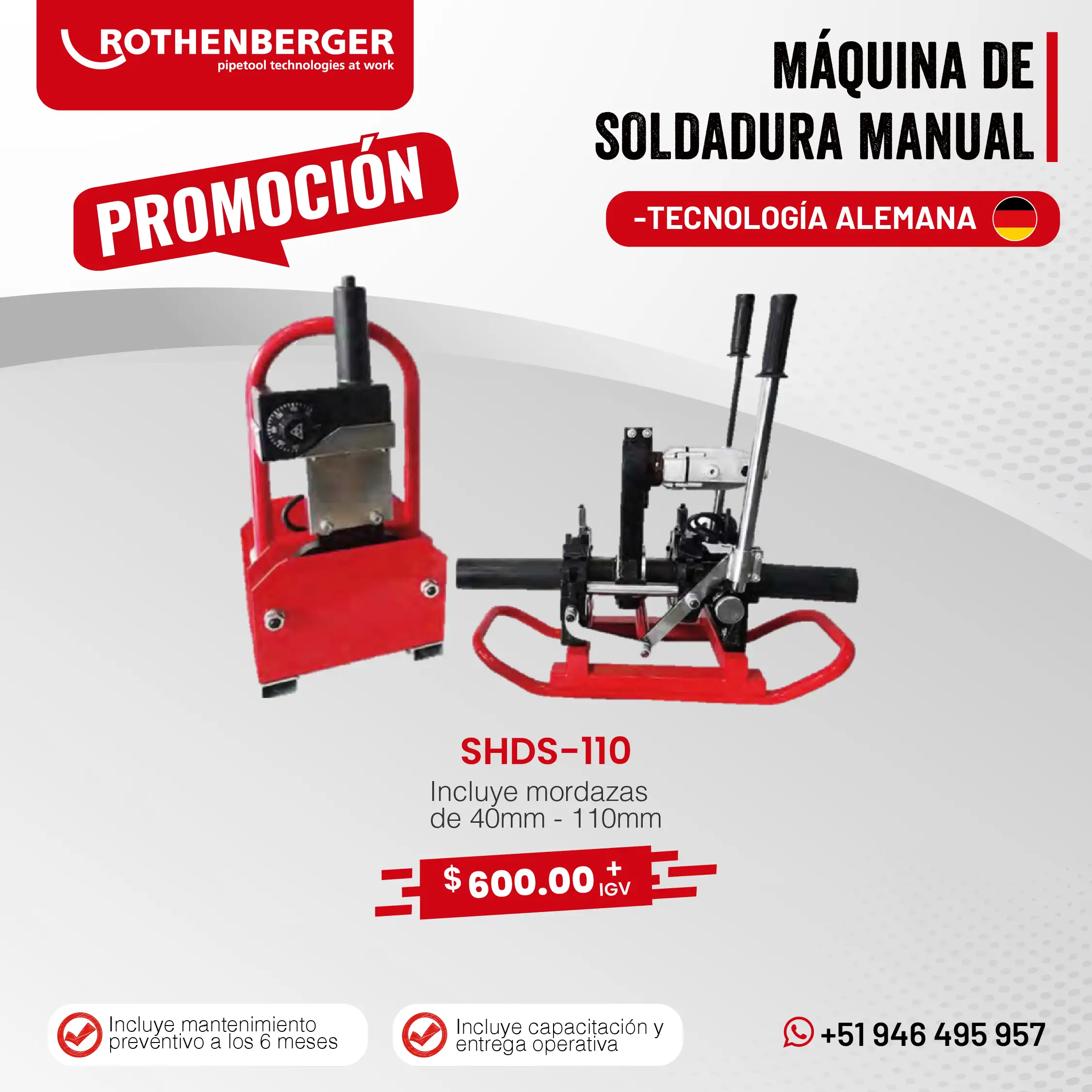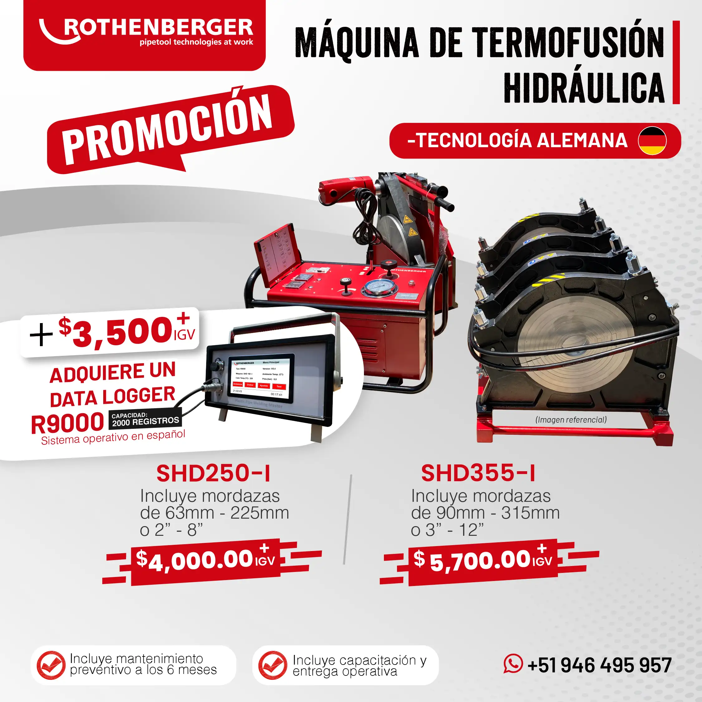 Las máquinas de termofusión y electrofusión de Rothenberger, fabricadas en Alemania y en China, son reconocidas por su eficiencia y confiabilidad en las tareas más exigentes de soldadura de tuberías. Su amplia gama de equipos y stock permanente permiten cubrir todas las necesidades que requiera la industria.